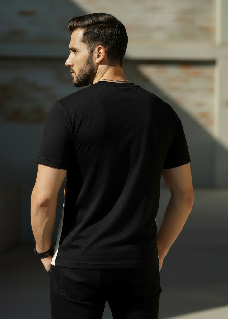 A faixa colorida na manga direita adiciona um detalhe exclusivo que diferencia esta camiseta de outras peças básicas, tornando-a uma escolha de destaque no seu guarda-roupa.