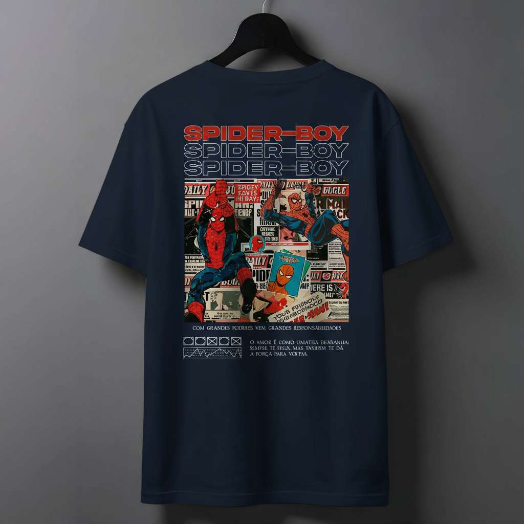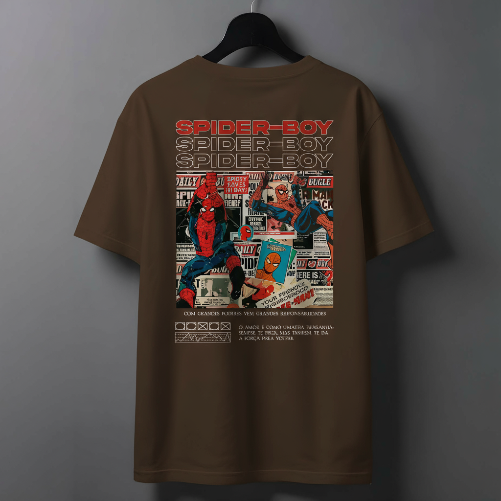 Design das Costas: Nas costas, um quadrinho exclusivo Casal Aranha dá vida à peça, capturando toda a força e personalidade da heroína em uma arte de alta definição. Logo abaixo, o destaque fica para a inscrição Spider-BOY, representando a coragem e independência de forma cativante e feminina.