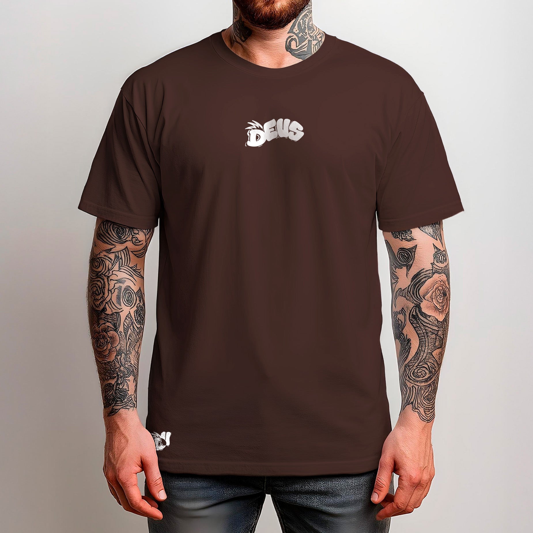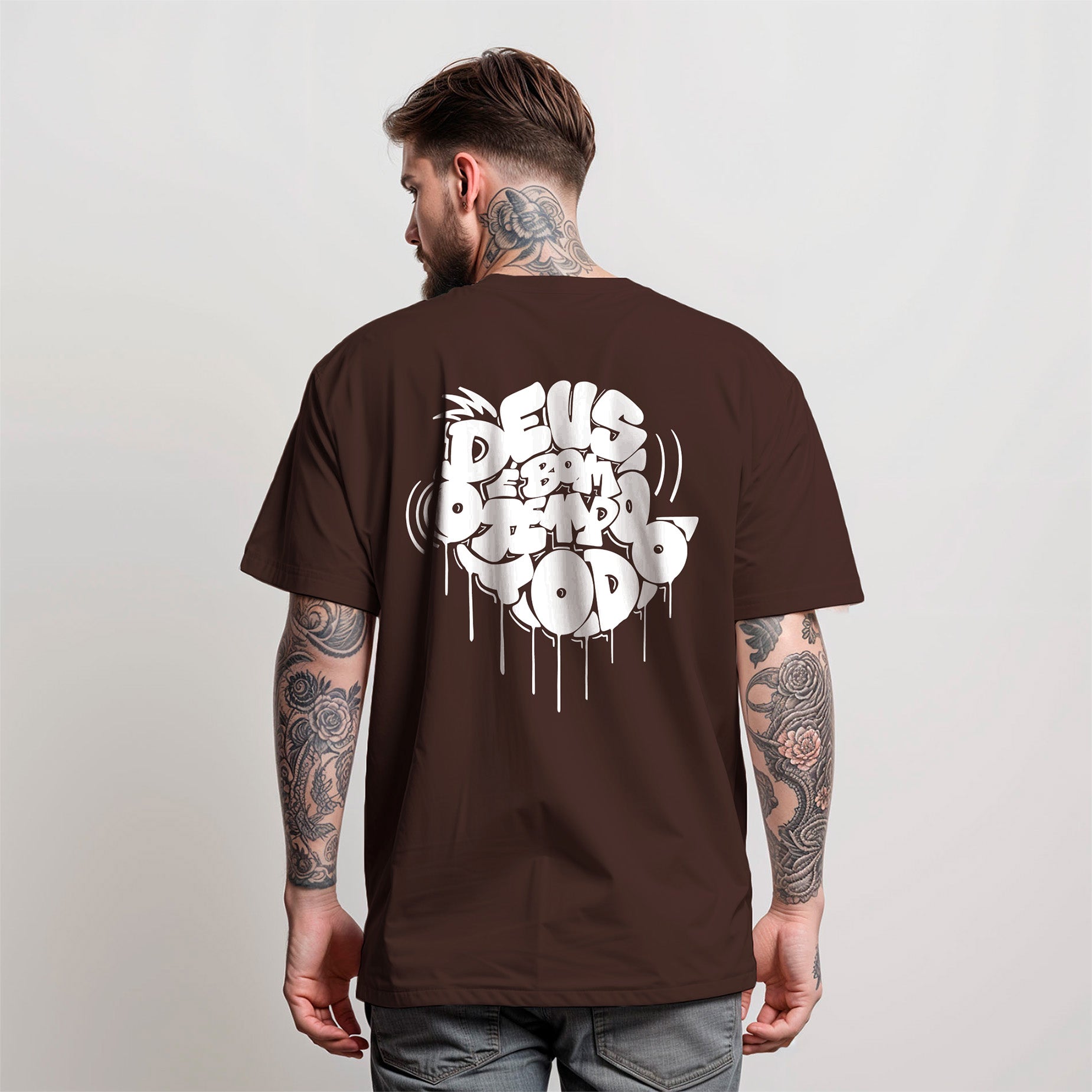 Nas costas, a frase ' Deus é bom o tempo todo ' aparece em letras grandes e escorridas, criando uma arte impactante e cheia de atitude. Na frente, a palavra 'Deus' está posicionada no centro do peito, simbolizando que Ele ocupa o centro do nosso coração.