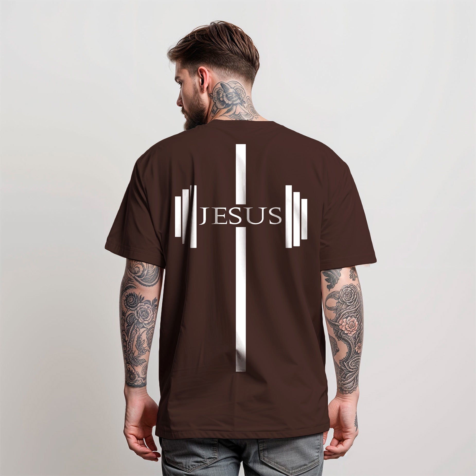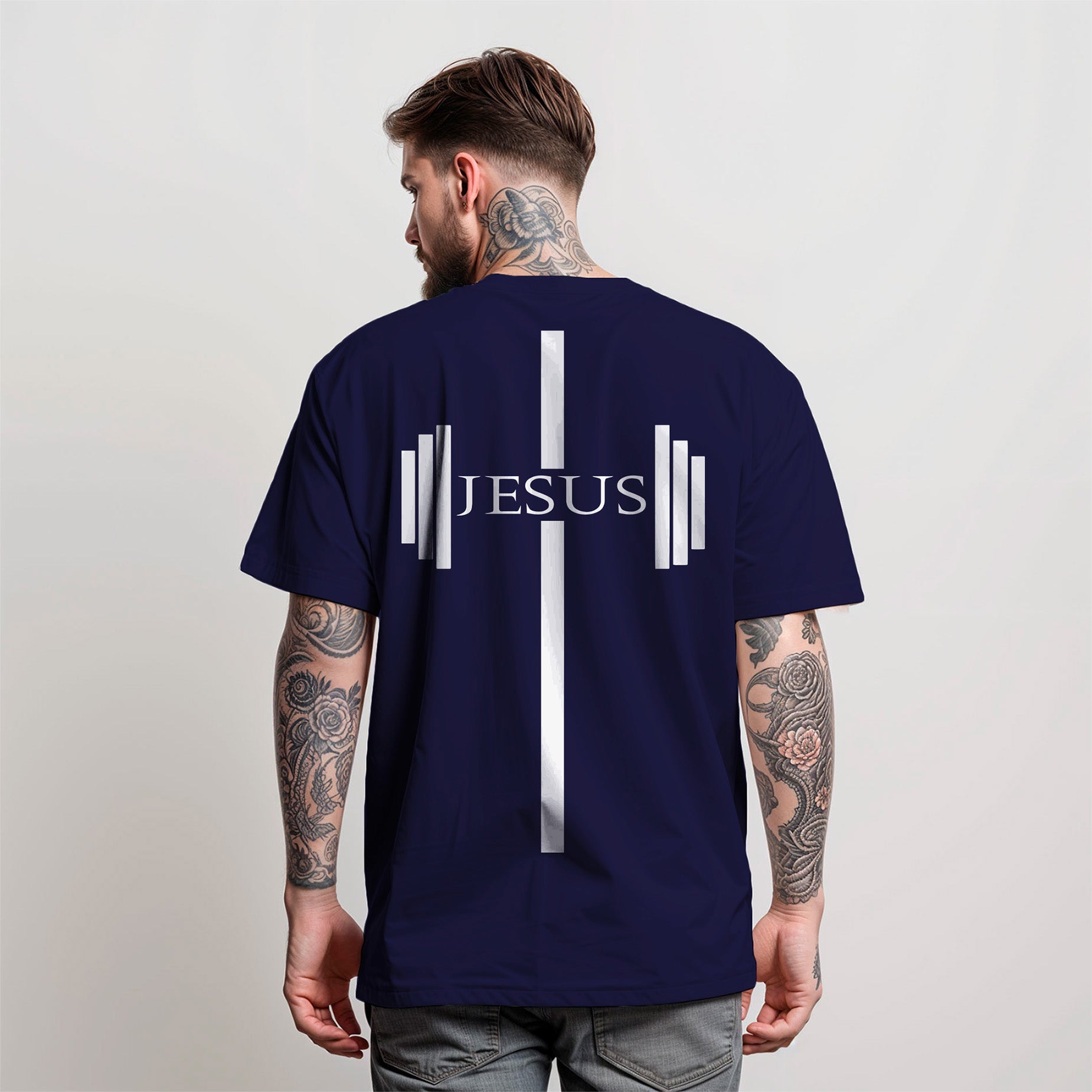 🔹 Frente : Um cabresto (pesinho de academia) com o nome "JESUS", simbolizando que a verdadeira força vem da fé e do propósito.