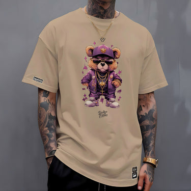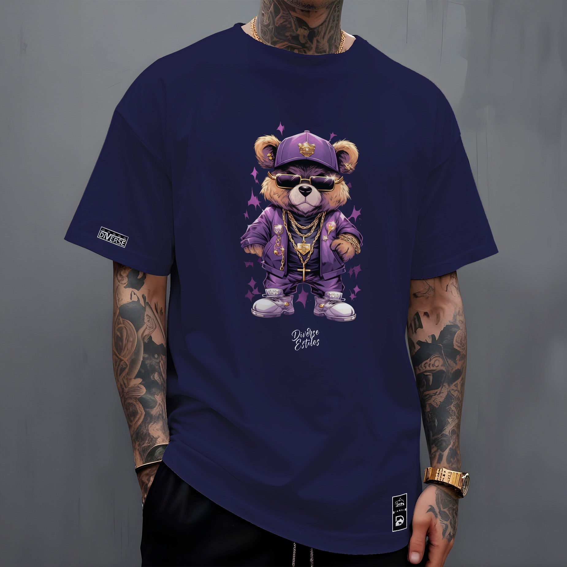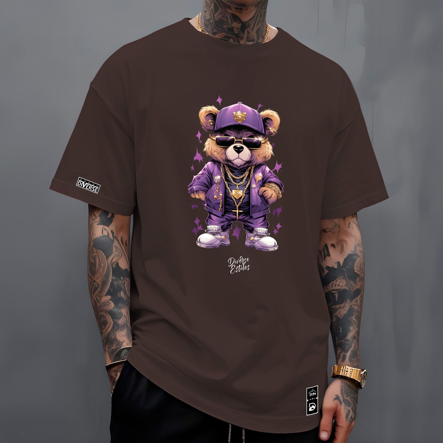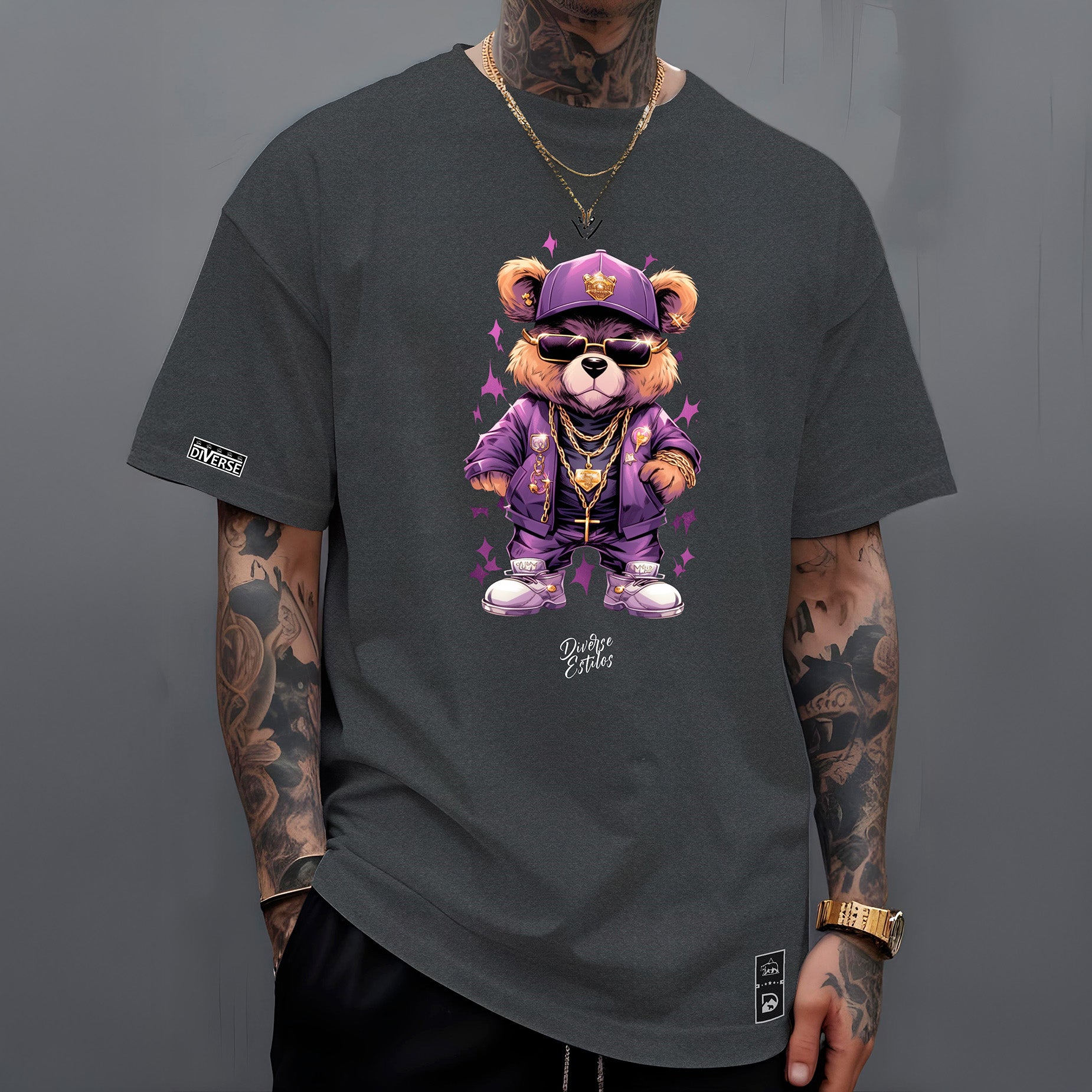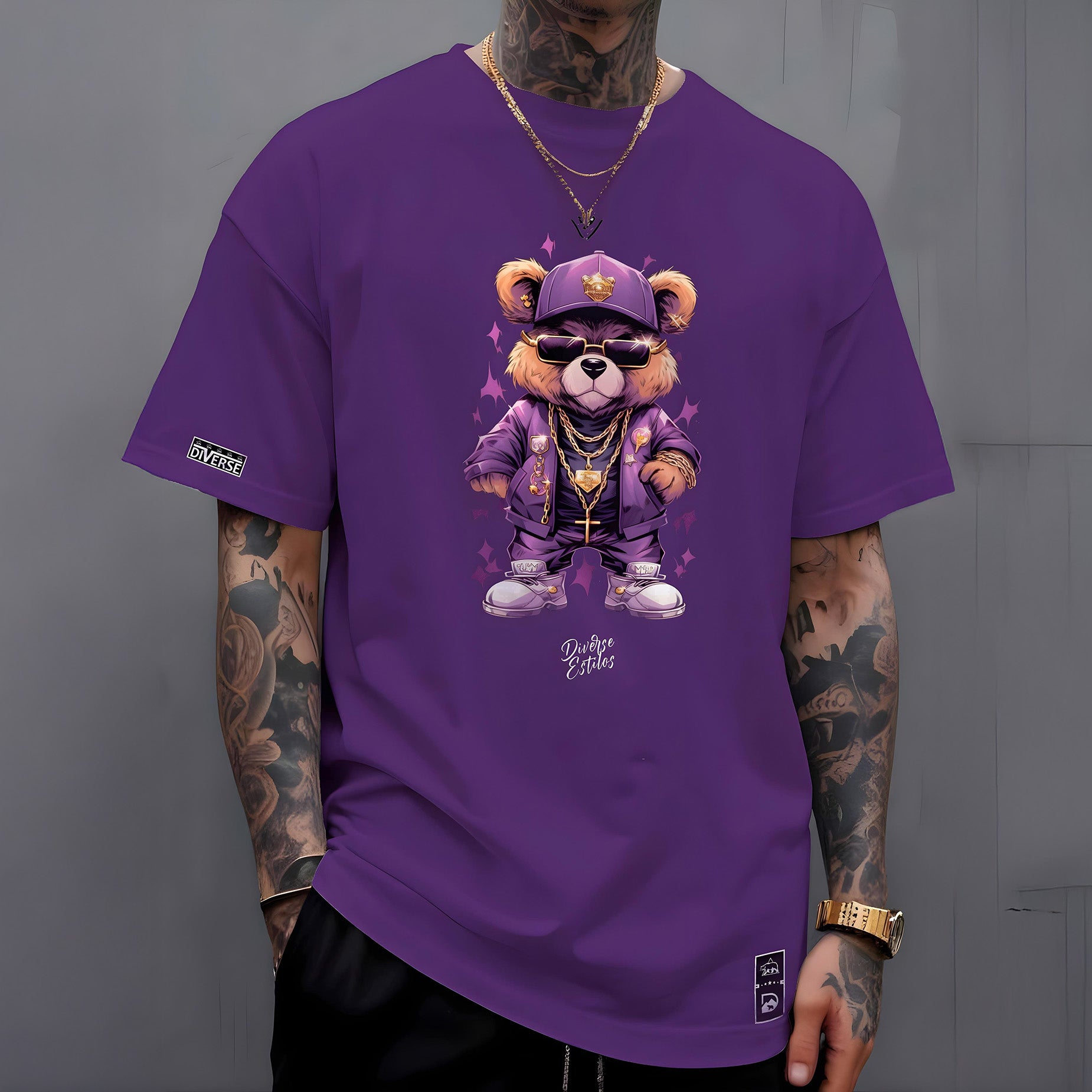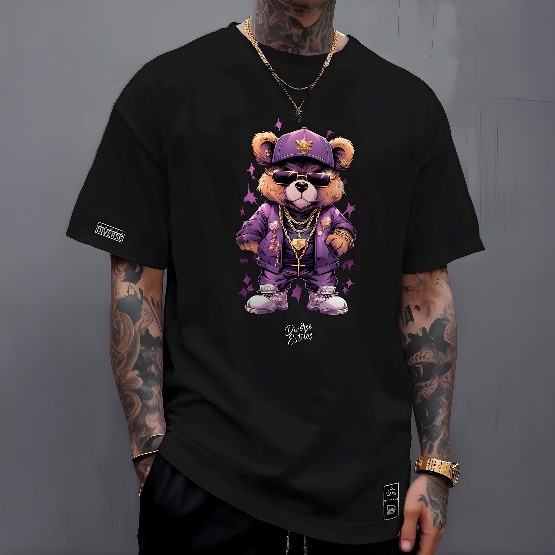 No centro da camiseta, um ursinho de pelúcia vestido com um conjunto vibrante roxo ostenta um boné roxo e óculos escuros. Adornadas com joias de ouro, essas peças complementam seus estilosa, conferindo um ar de sofisticação descomprometida que captura olhares.