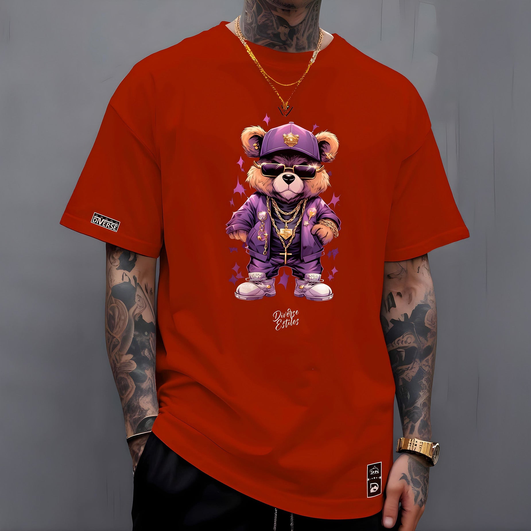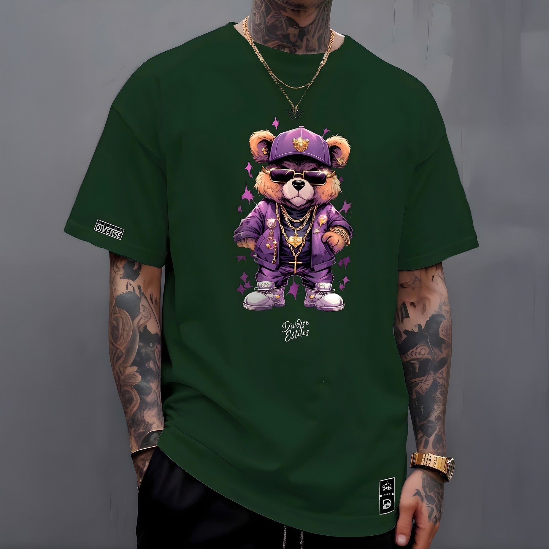 Apresentando a Camiseta "Plush Swagger" de Diversos Estilos, uma combinação única de estilo audacioso e elegante urbano, personificada em um ursinho de pelúcia que sabe exatamente como se destacar na multidão.