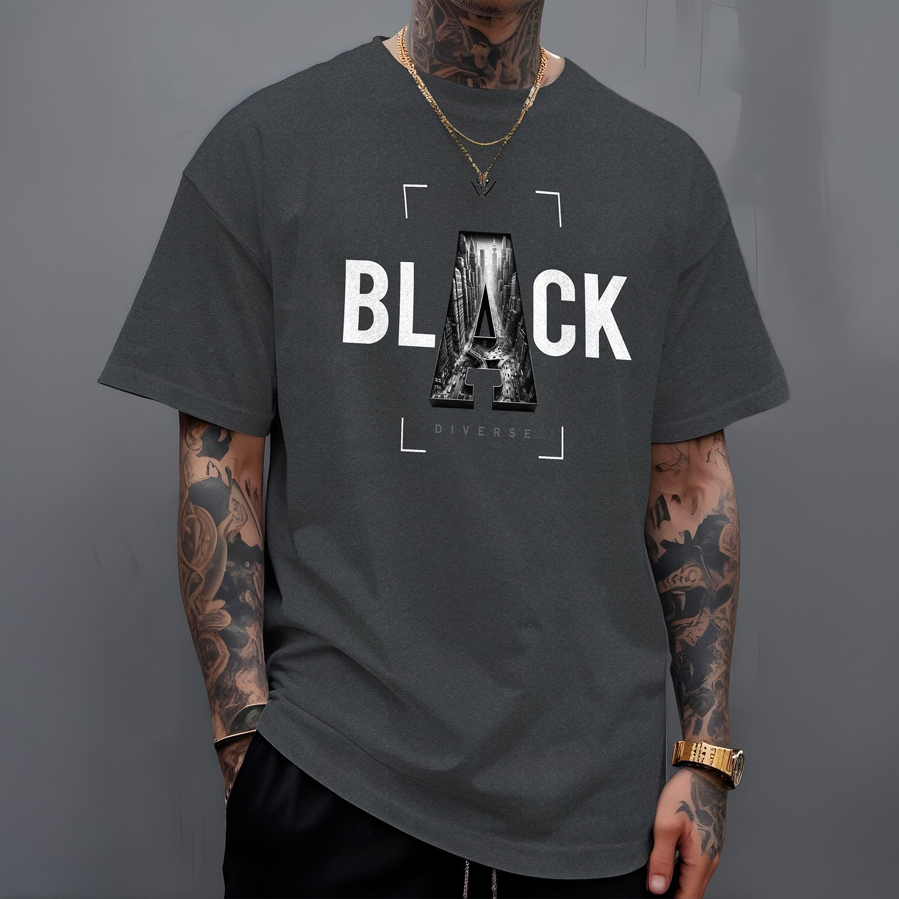 A palavra "Black" é estampada com um design exclusivo, onde a letra "A" é proveniente de uma silhueta estilizada de uma metrópole, capturando a essência de arranha-céus e a vida agitada das grandes cidades. Esta abordagem artística não é apenas um design, mas uma história visual contada através de uma única letra.