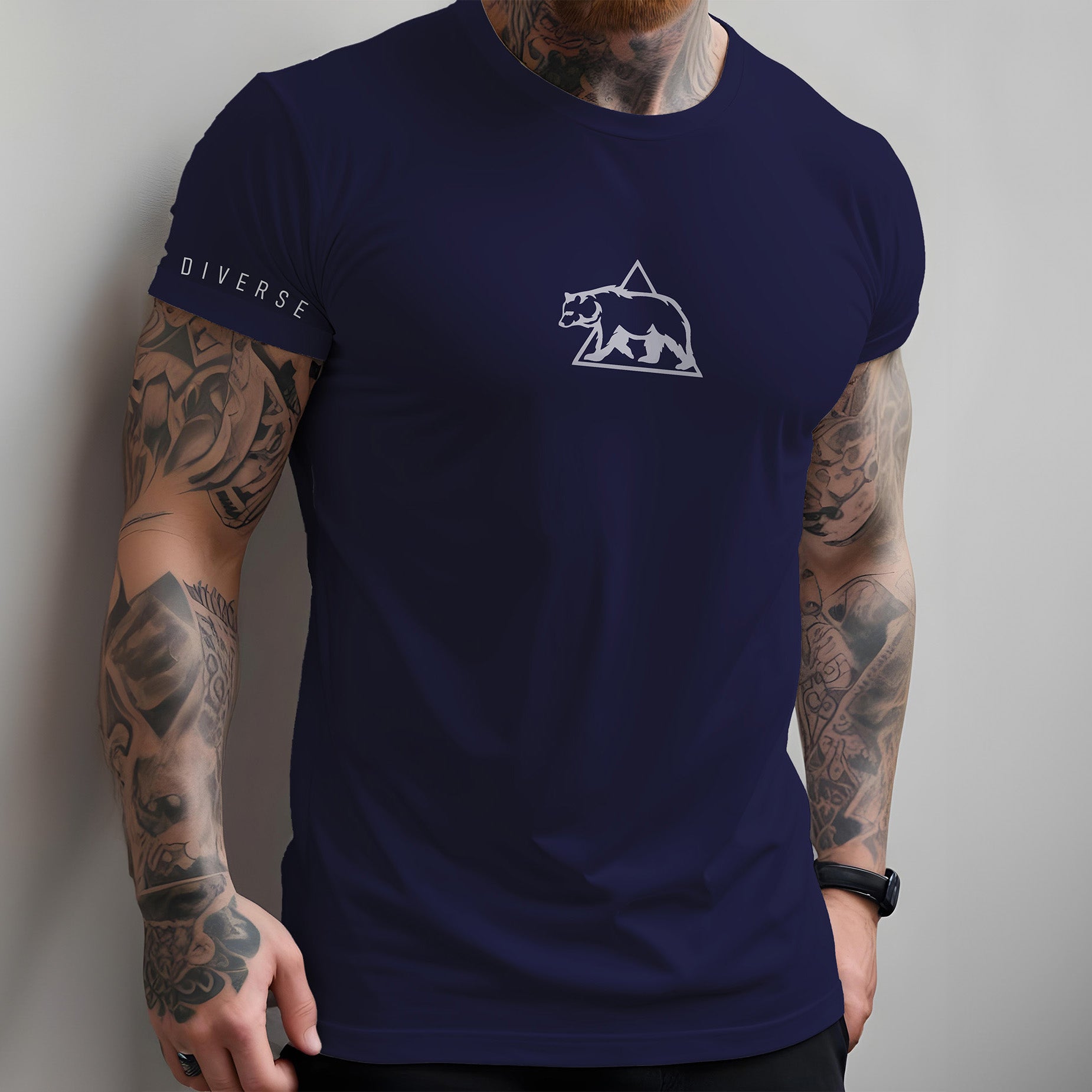 A estampa central apresenta um urso estilizado dentro de um triângulo, representando força e resiliência. A simplicidade do desenho em preto sobre o tecido branco proporciona um contraste marcante e elegante.