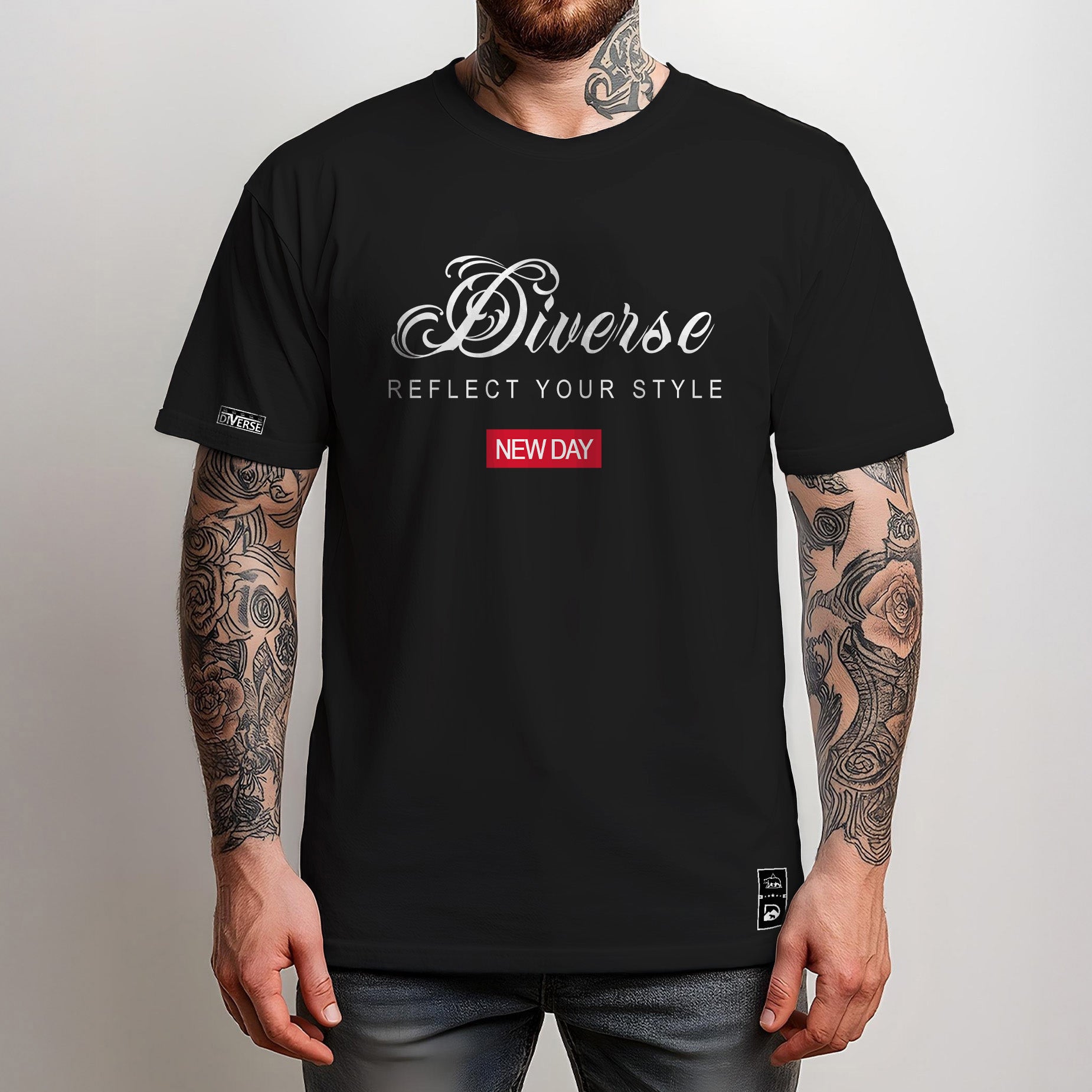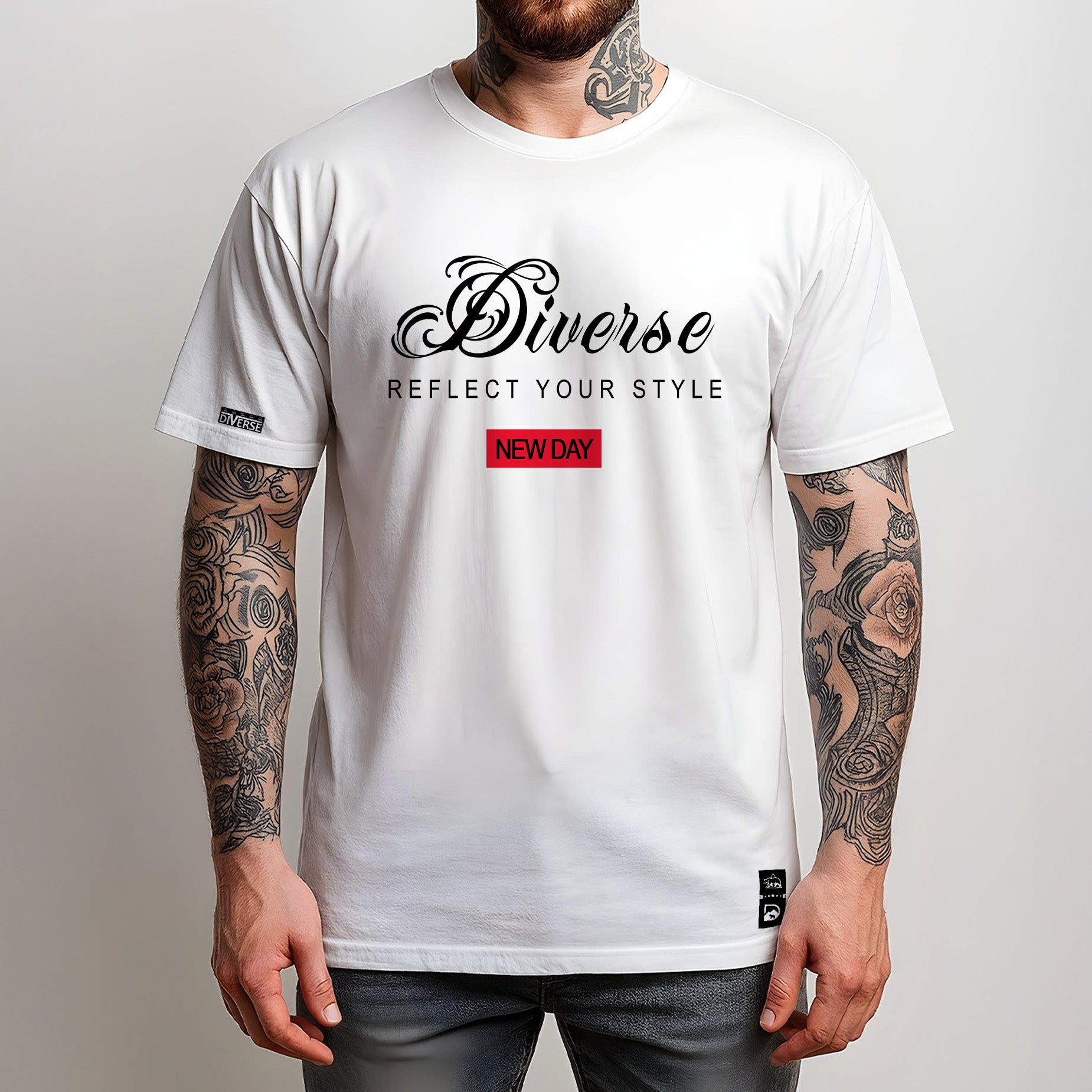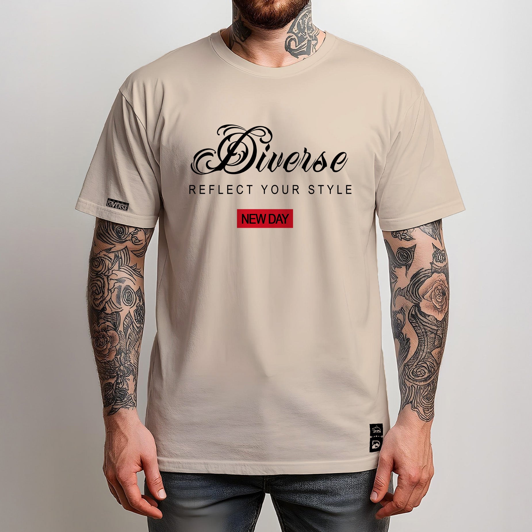 Reflete seu estilo, reflete sua atitude. A palavra "Diverse" vem estampada no peito, destacando um estilo moderno e ao mesmo tempo clássico, com uma tipografia cursiva elegante que traz uma vibe única; uma declaração: você não é definido por rótulos, você é diverso, você é plural, e seu estilo reflete isso.