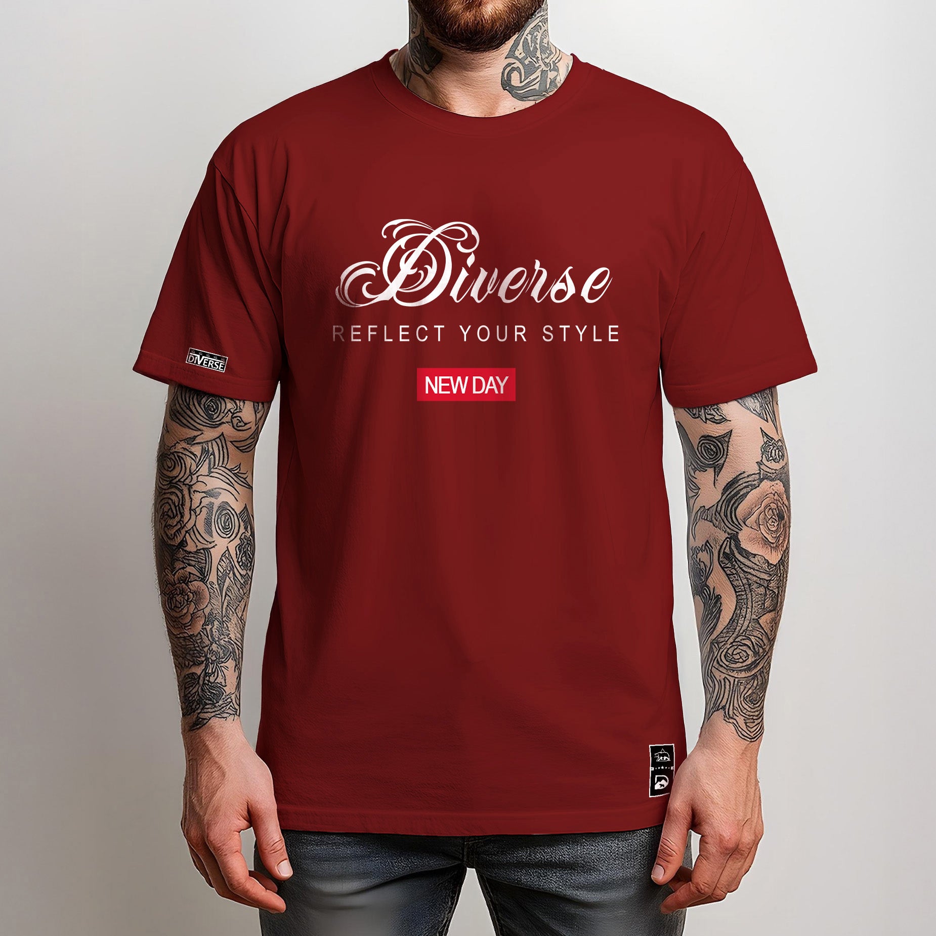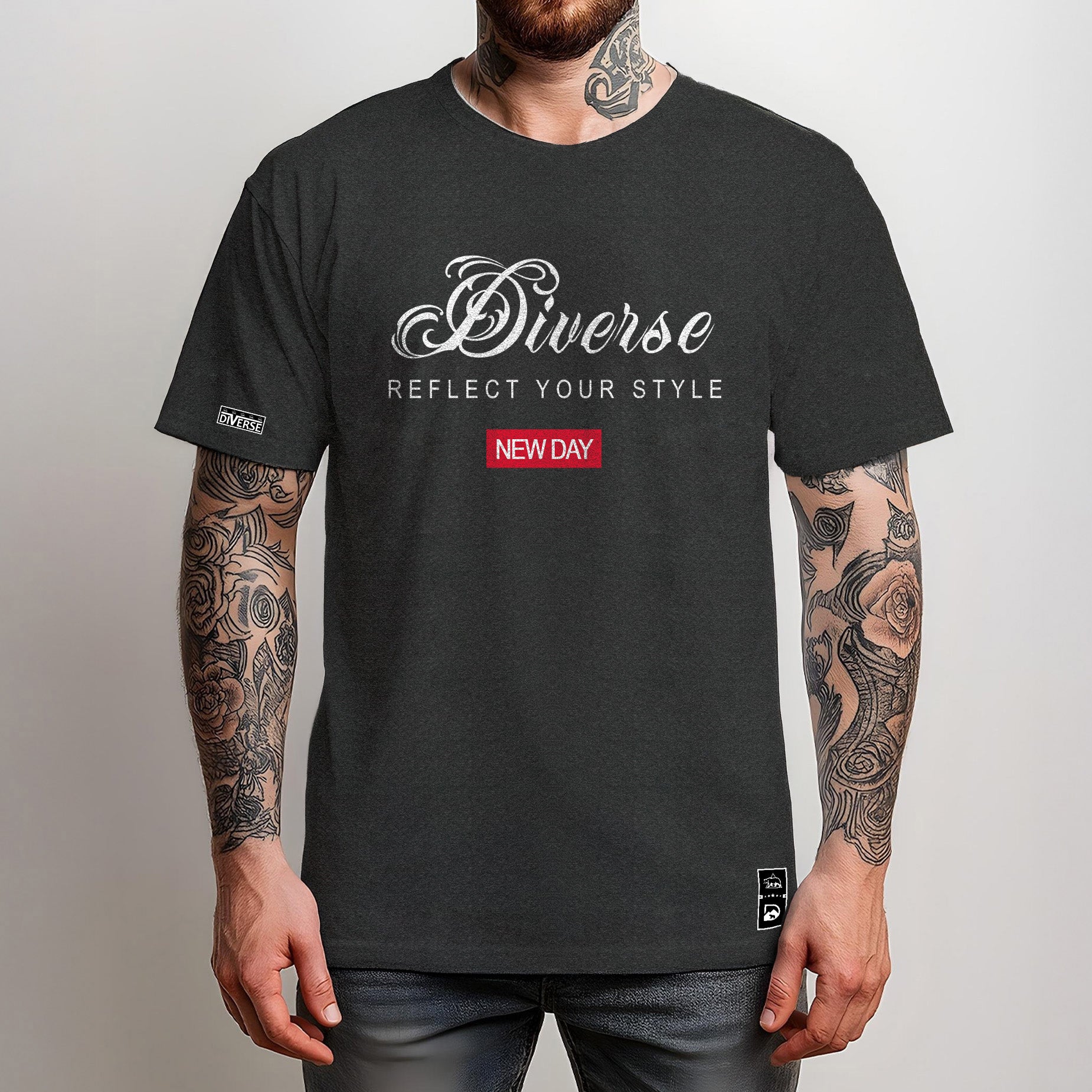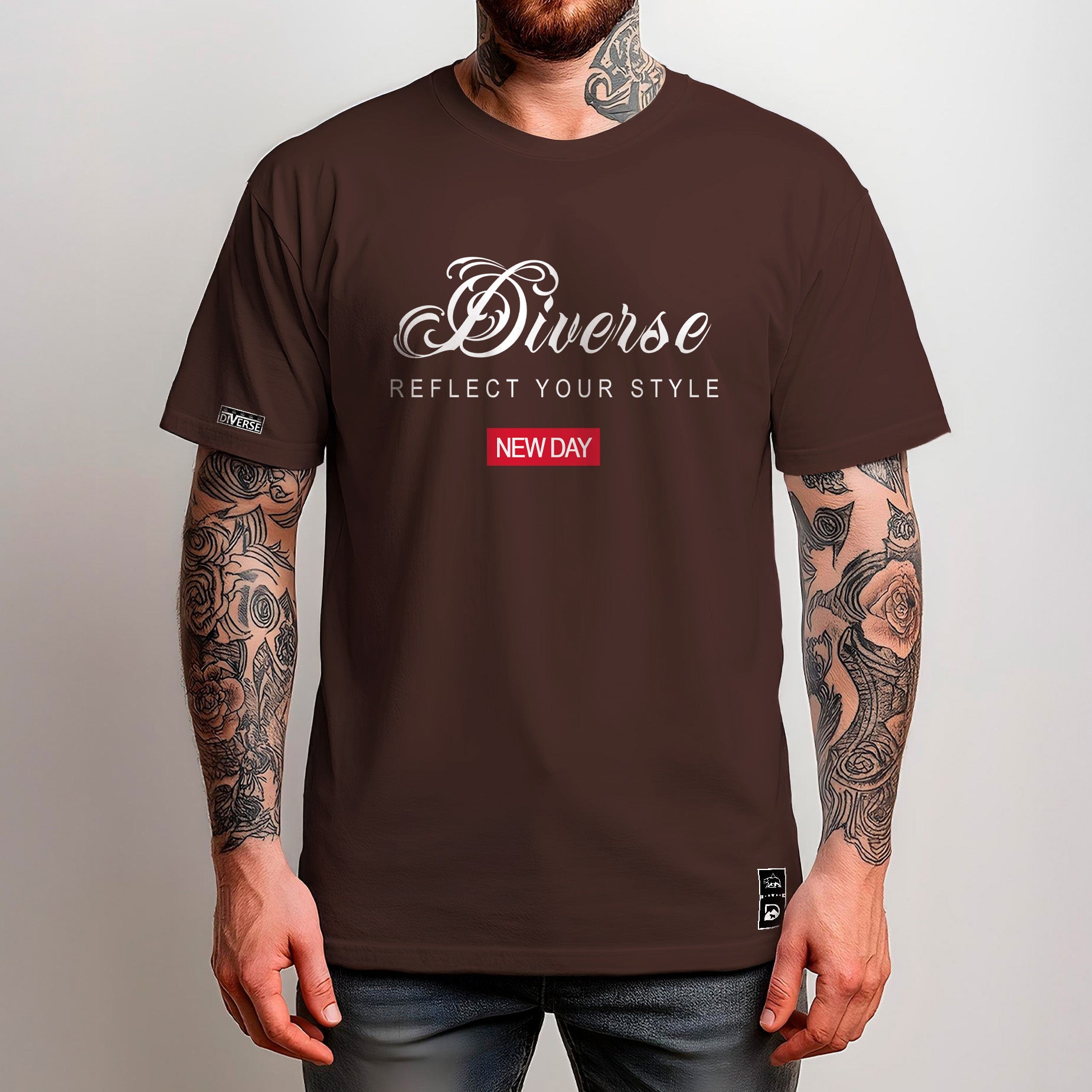 Reflete seu estilo, reflete sua atitude. A palavra "Diverse" vem estampada no peito, destacando um estilo moderno e ao mesmo tempo clássico, com uma tipografia cursiva elegante que traz uma vibe única; uma declaração: você não é definido por rótulos, você é diverso, você é plural, e seu estilo reflete isso.