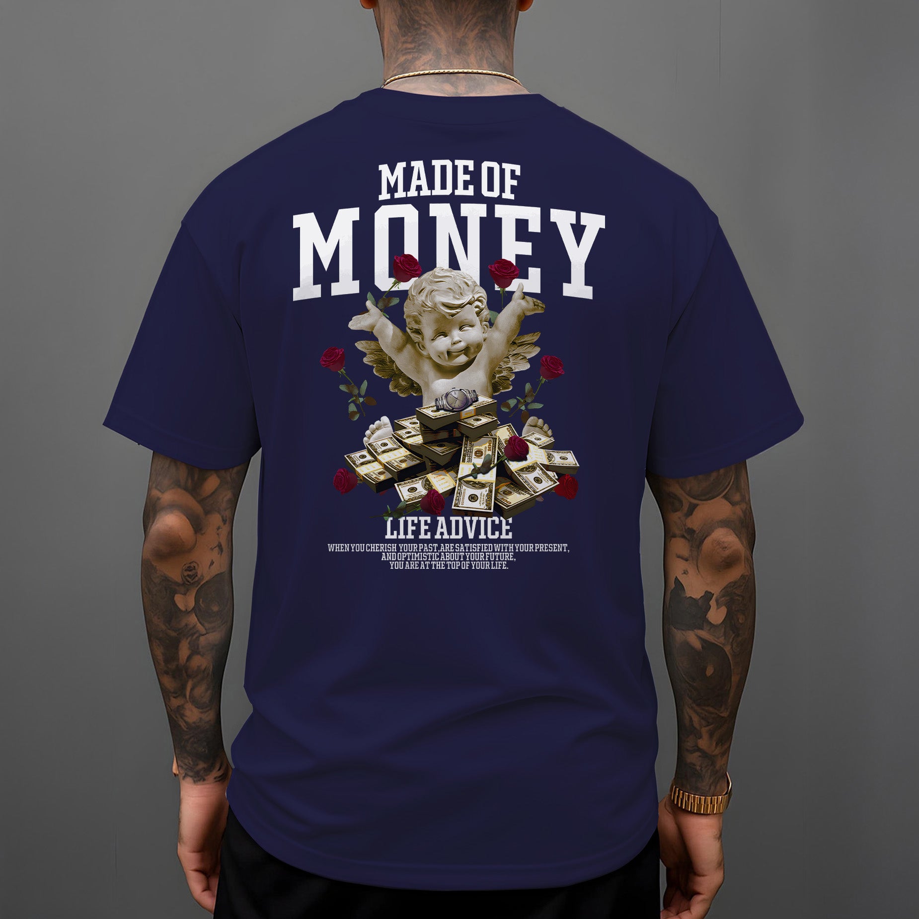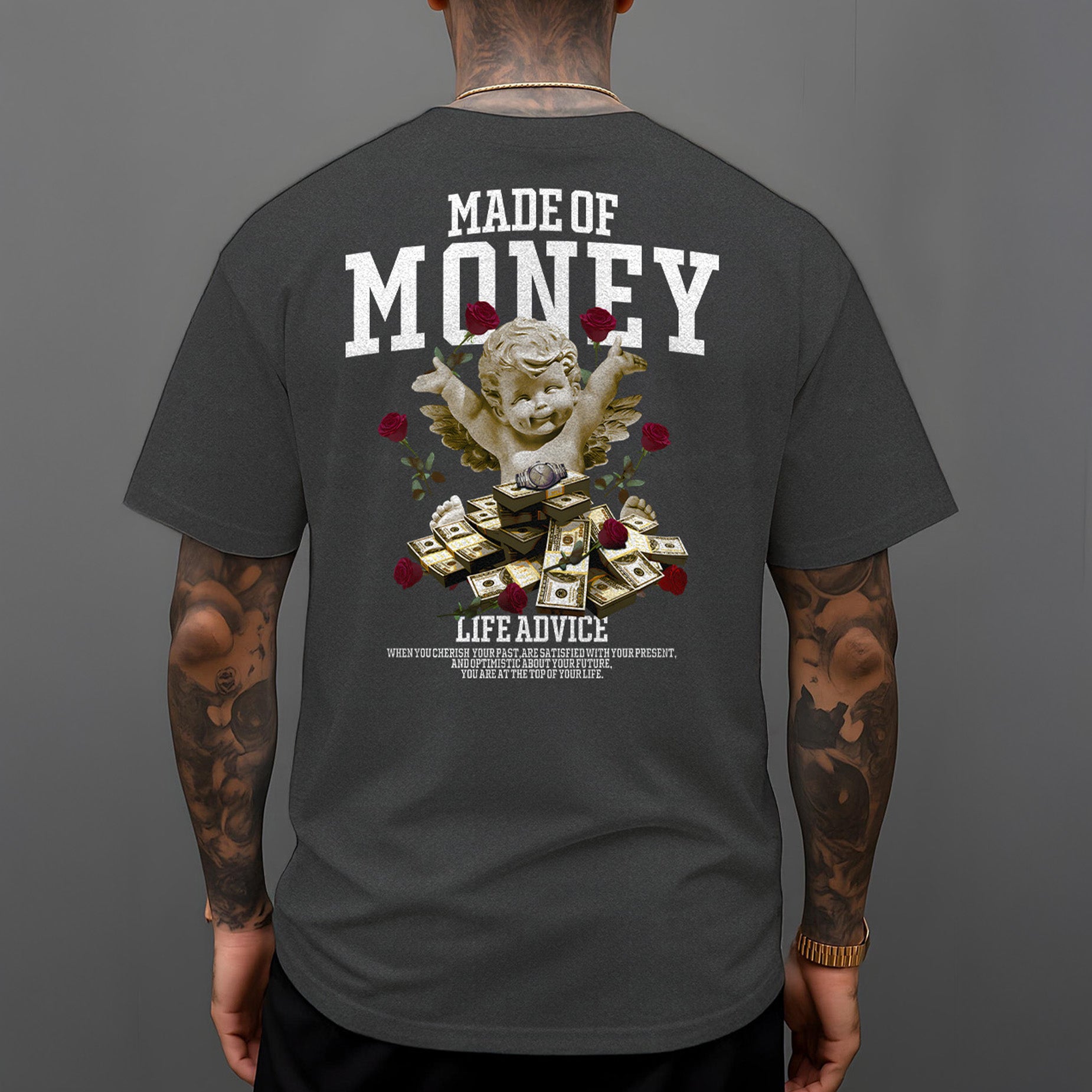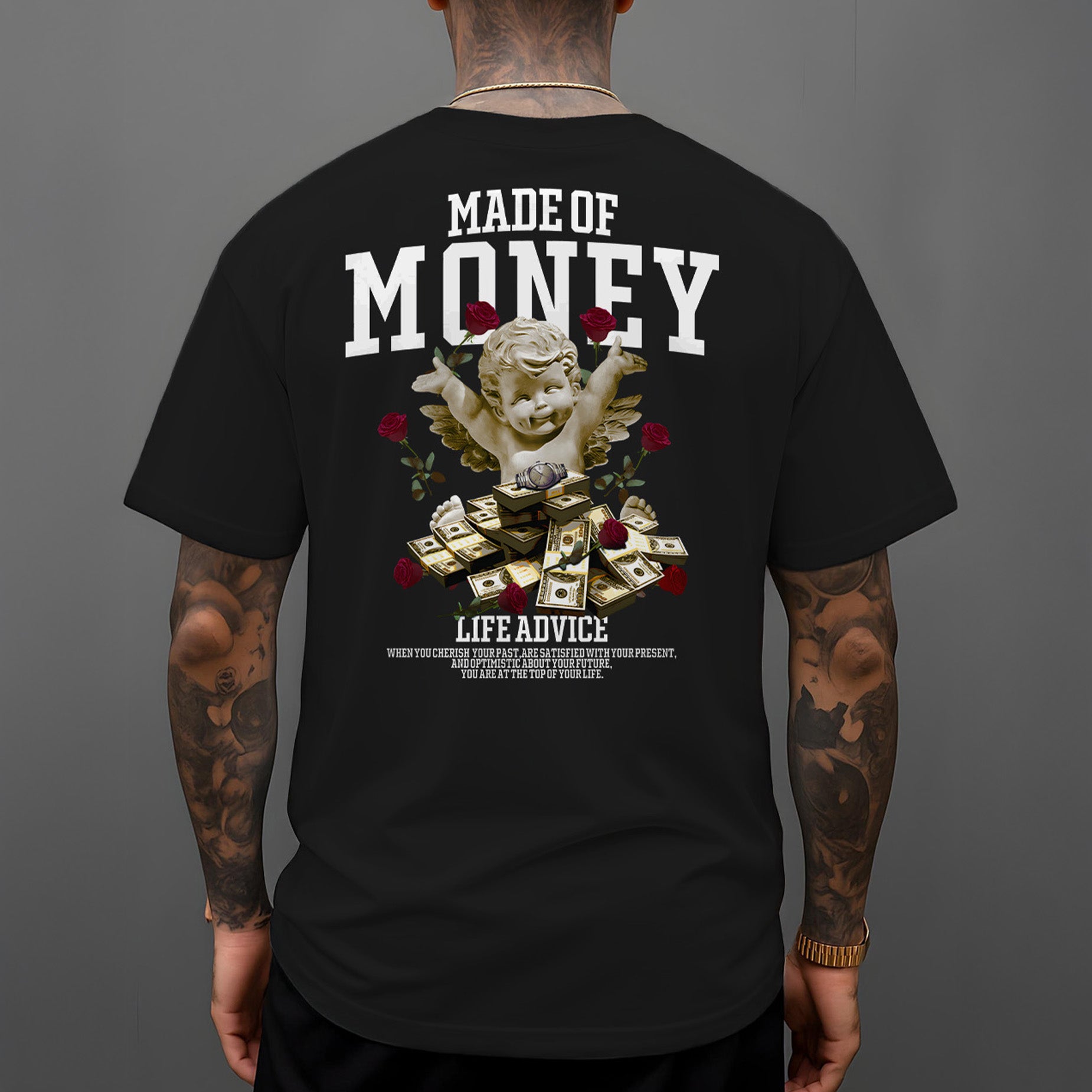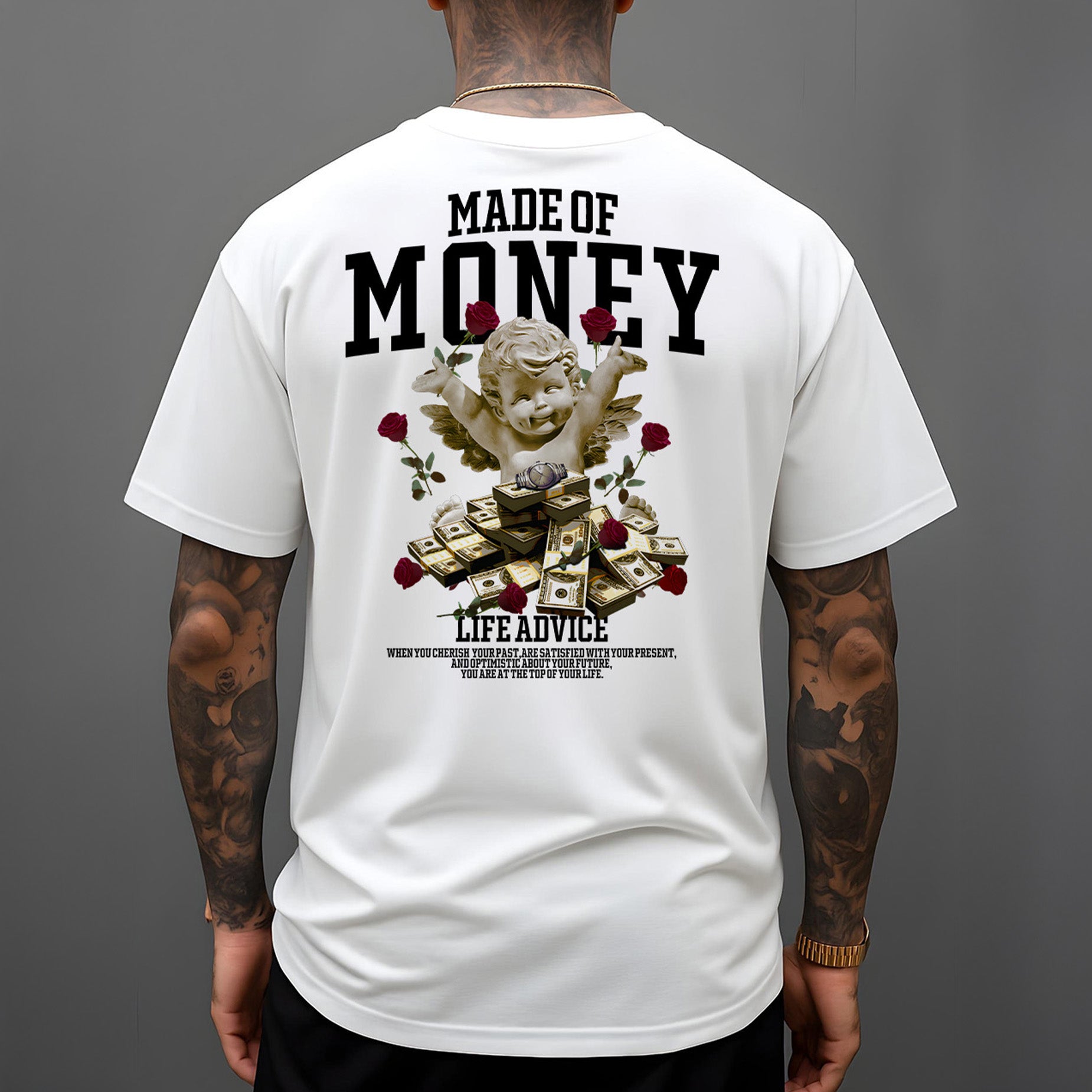 Nas costas da camiseta, a estampa apresenta um anjo rodeado por rosas e pilhas de dinheiro, simbolizando abundância e proteção divina. A frase " Feito de Dinheiro " em letras grandes e audaciosas se destaca acima da imagem, enquanto a mensagem " CONSELHOS DE VIDA " abaixo reforça a filosofia de vida e sucesso: " Quando você valoriza seu passado, está satisfeito com seu presente e otimista em relação ao seu futuro, você está no topo de sua vida. "