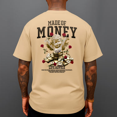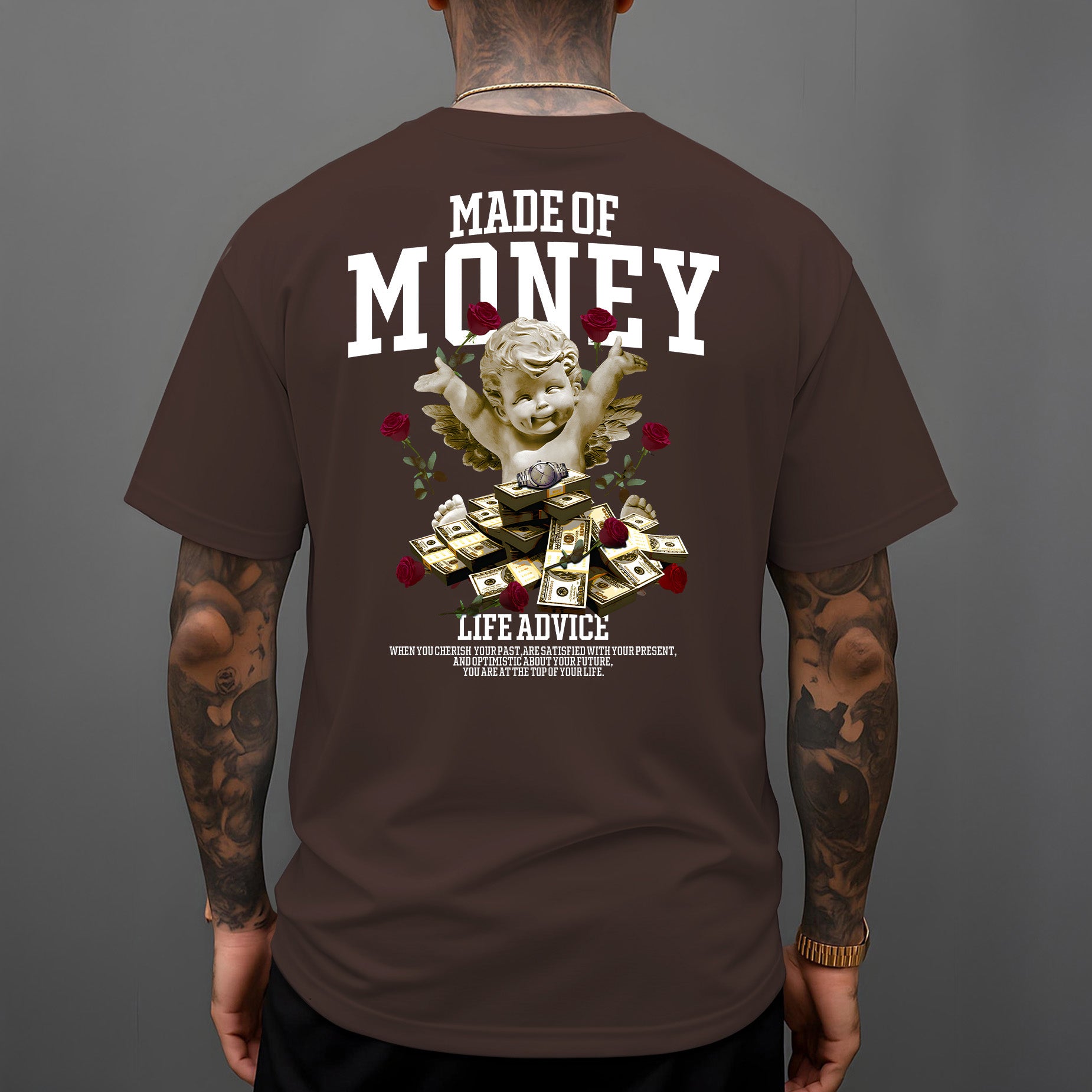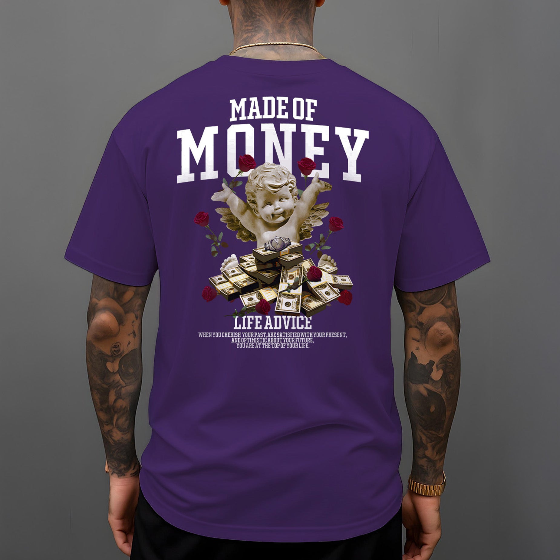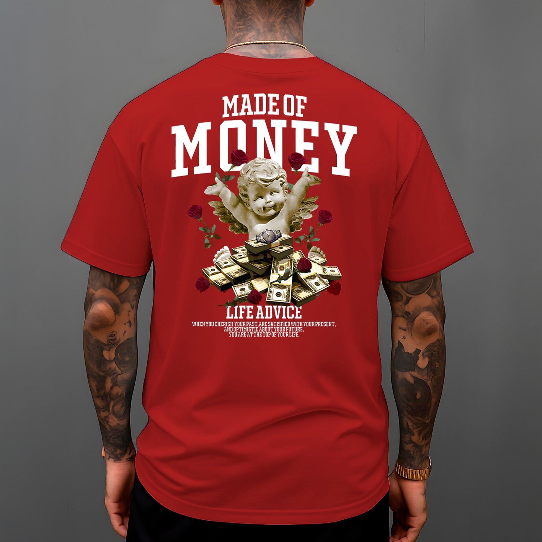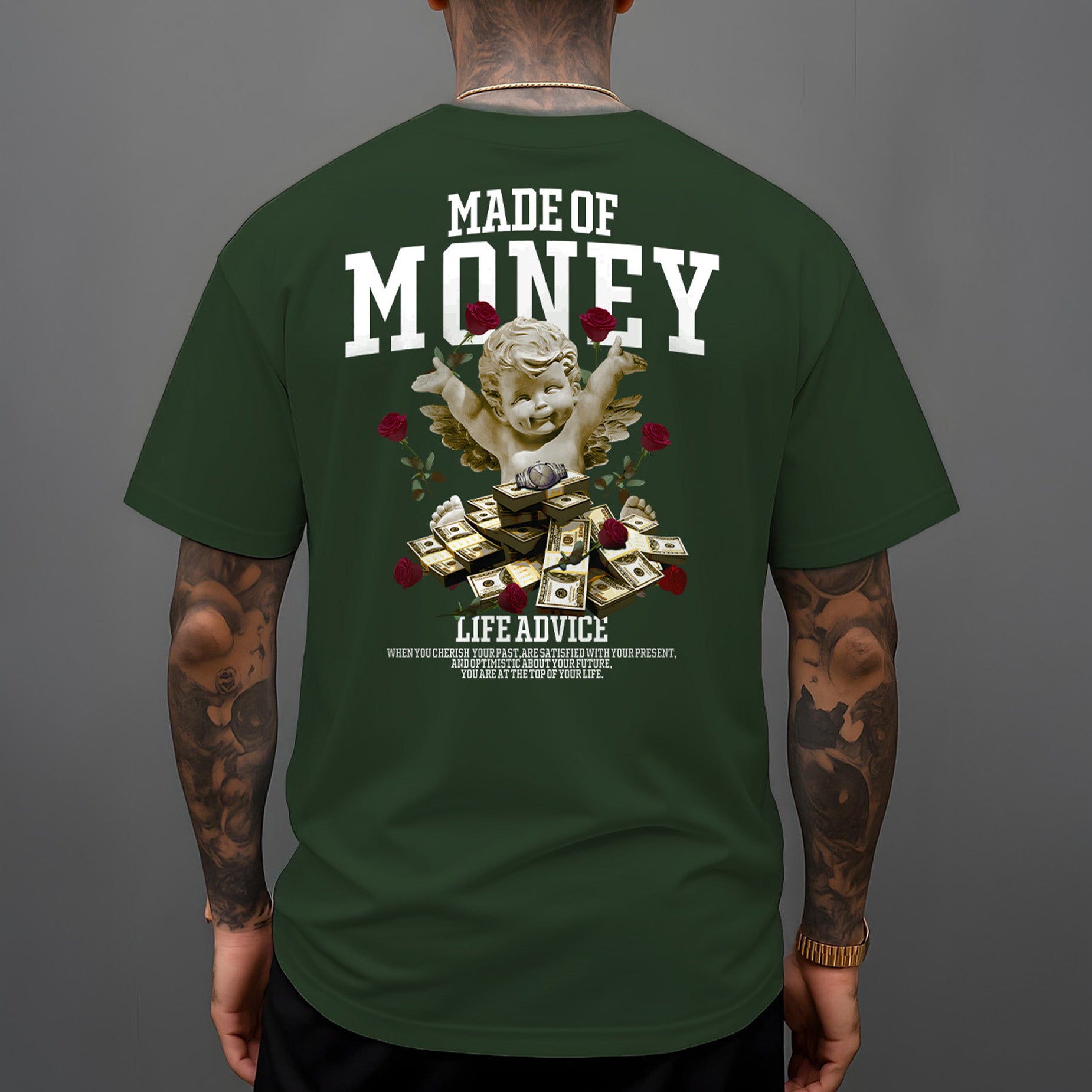 Nas costas da camiseta, a estampa apresenta um anjo rodeado por rosas e pilhas de dinheiro, simbolizando abundância e proteção divina. A frase " Feito de Dinheiro " em letras grandes e audaciosas se destaca acima da imagem, enquanto a mensagem " CONSELHOS DE VIDA " abaixo reforça a filosofia de vida e sucesso: " Quando você valoriza seu passado, está satisfeito com seu presente e otimista em relação ao seu futuro, você está no topo de sua vida. "