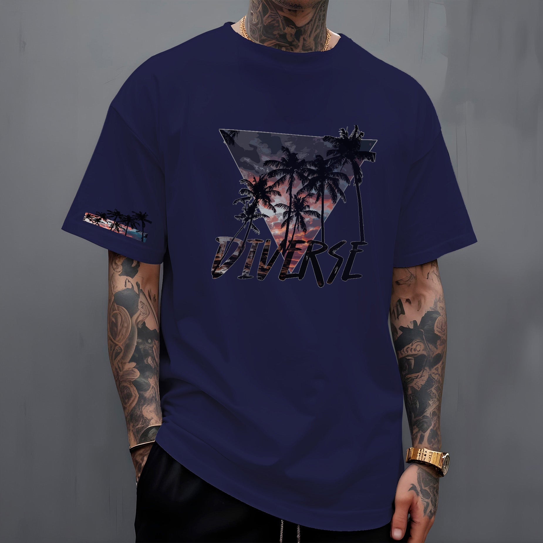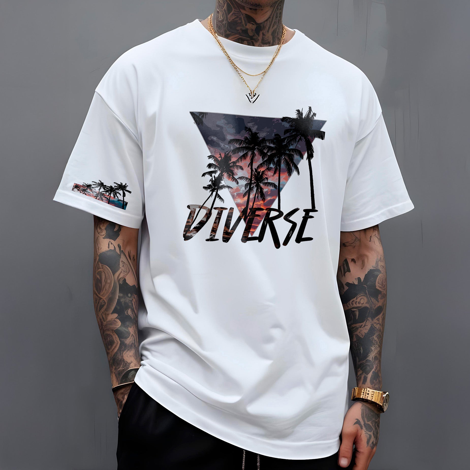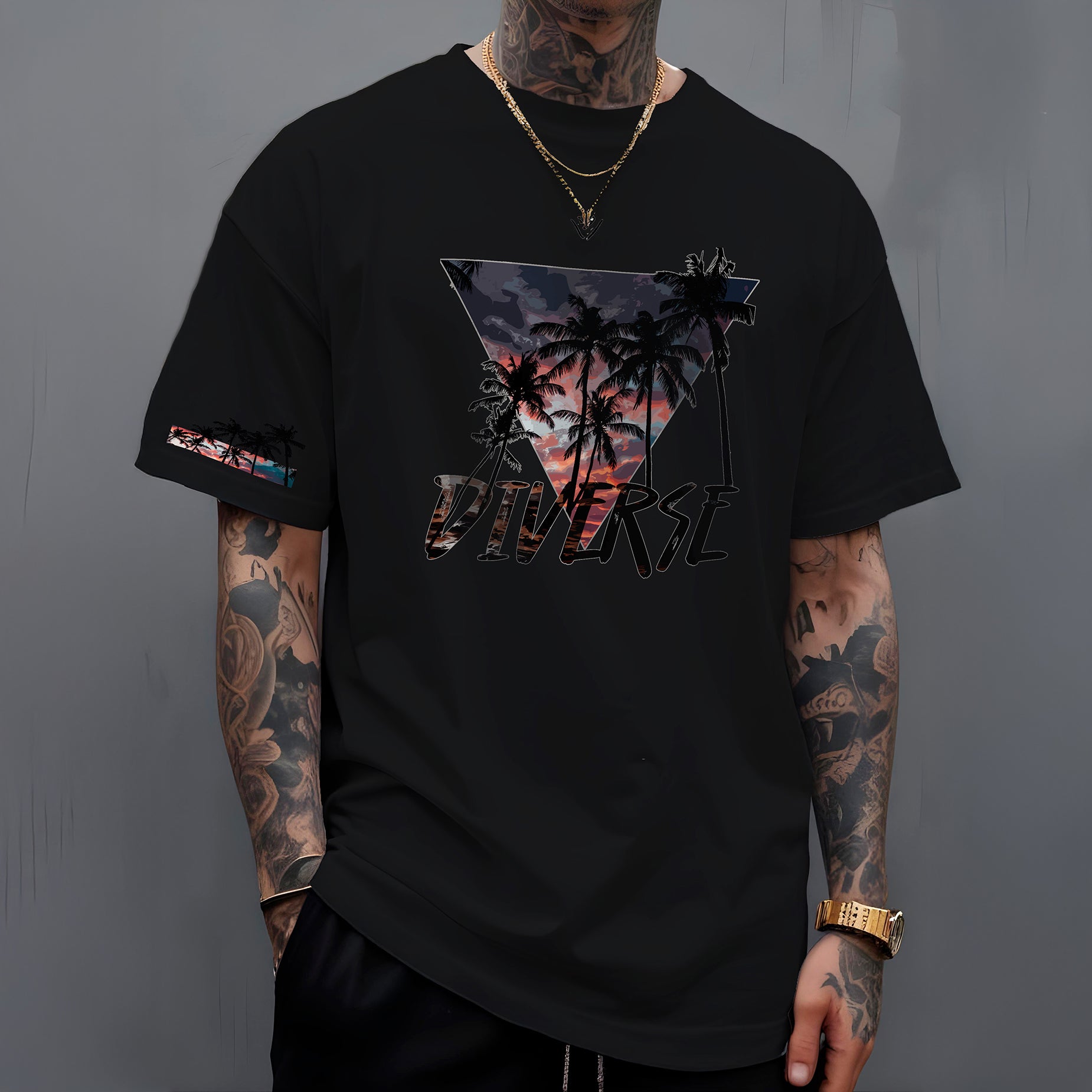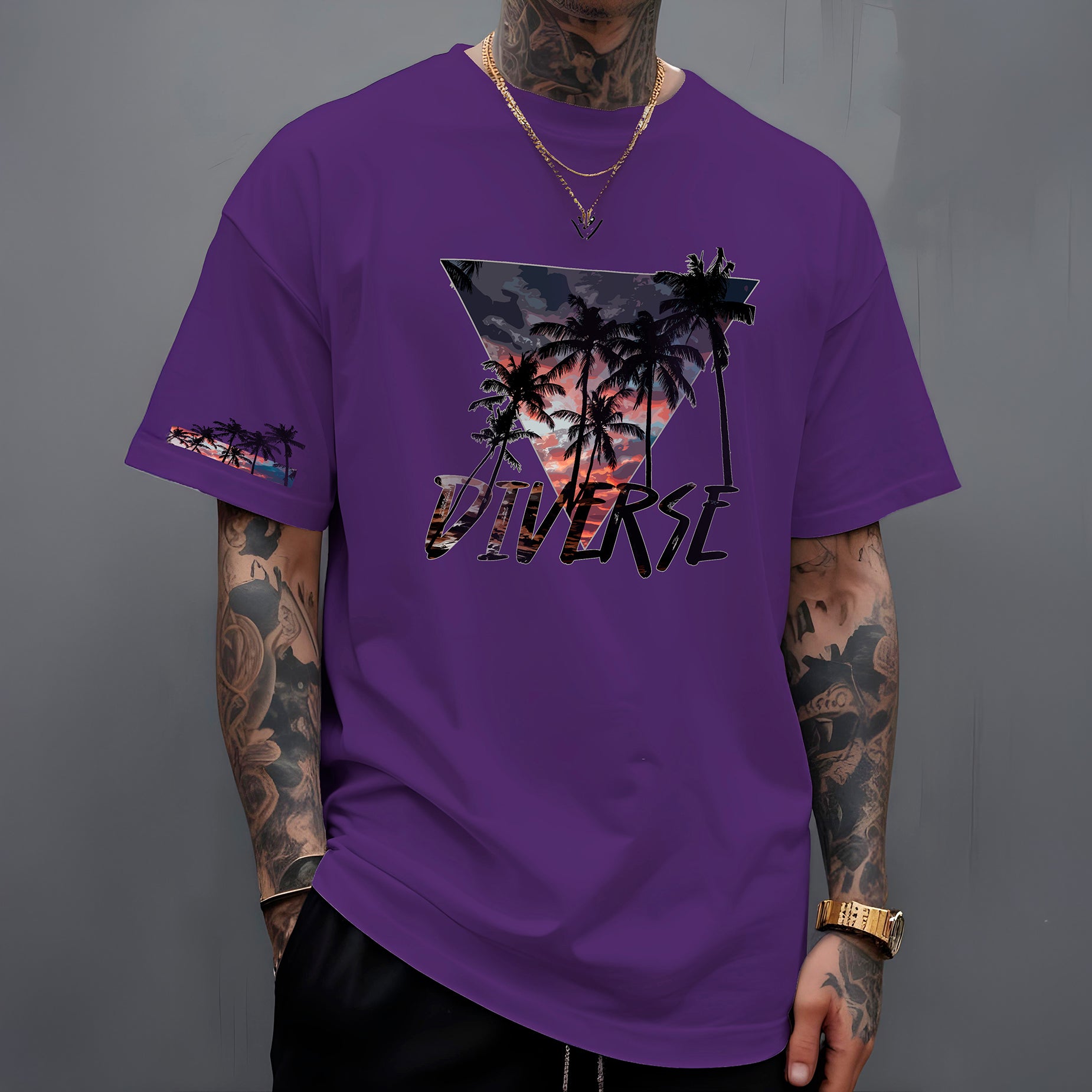 Leve o calor e a beleza dos trópicos com você! A camiseta " Diverse Tropical " apresenta um design vibrante e cheio de estilo. Nas costas, um triângulo preenchido com uma paisagem tropical deslumbrante, com um céu em tons de laranja e roxo, evoca o charme das cores do pôr do sol compondo a paisagem dos coqueiros. Abaixo, o nome DIVERSE em destaque reforça a identidade da marca.