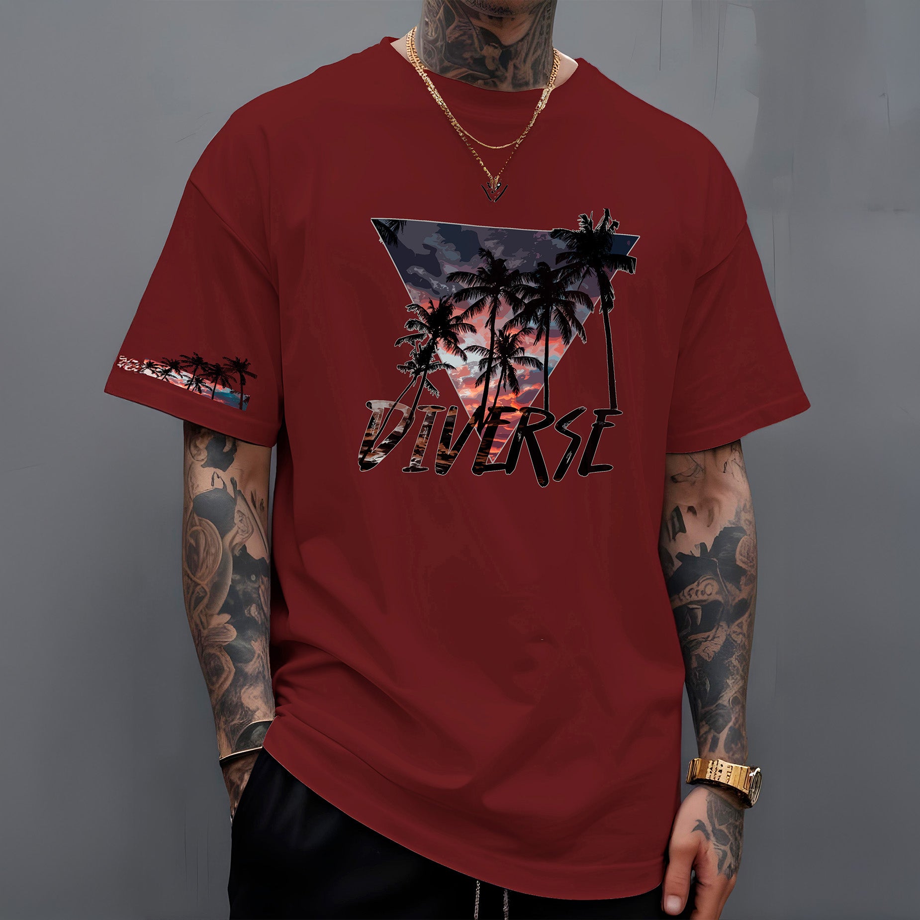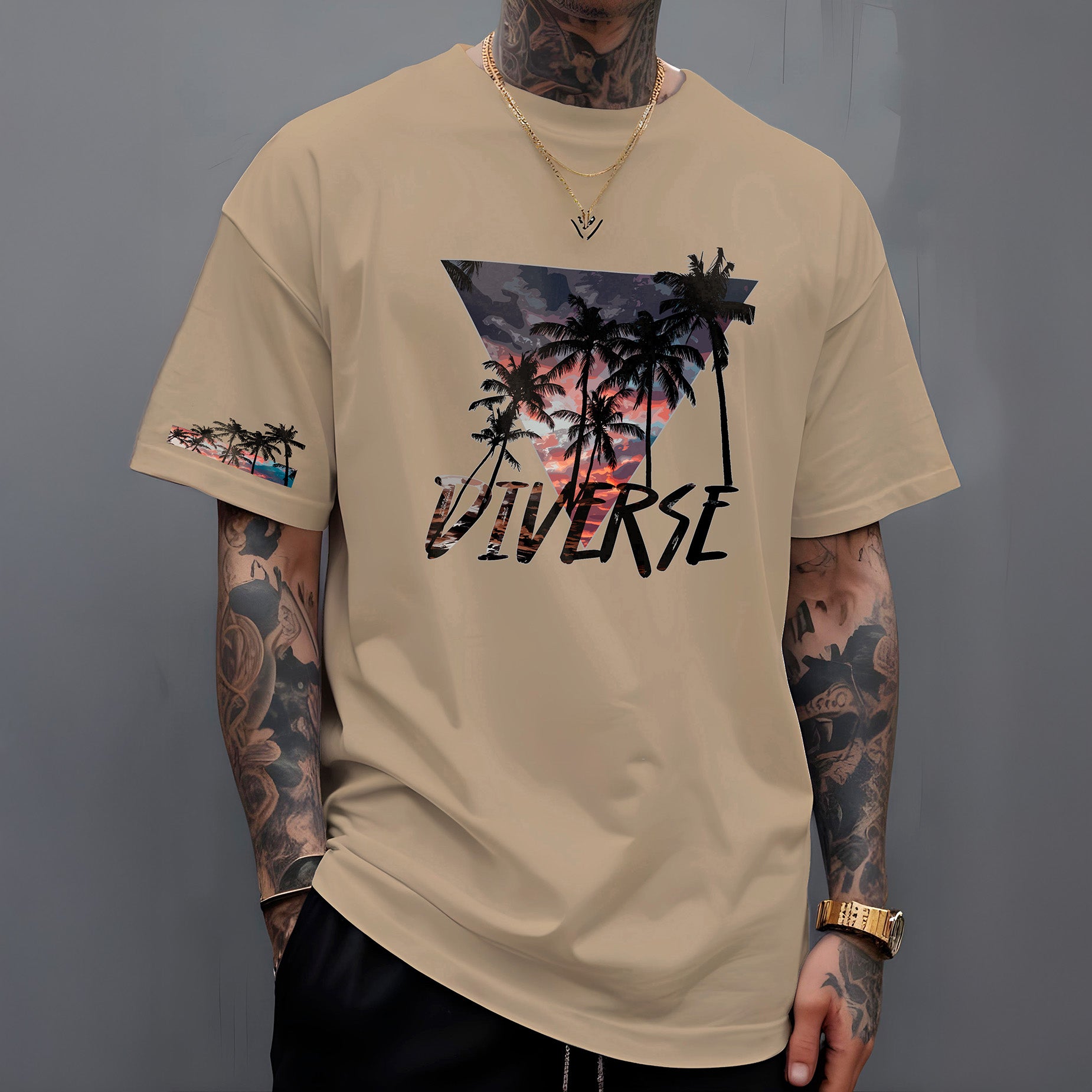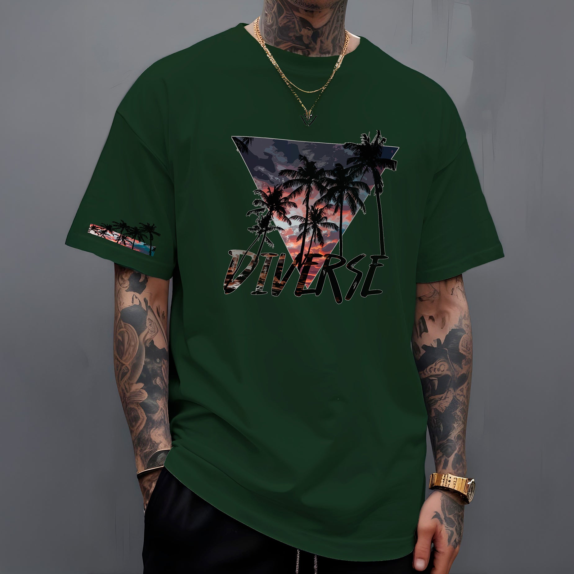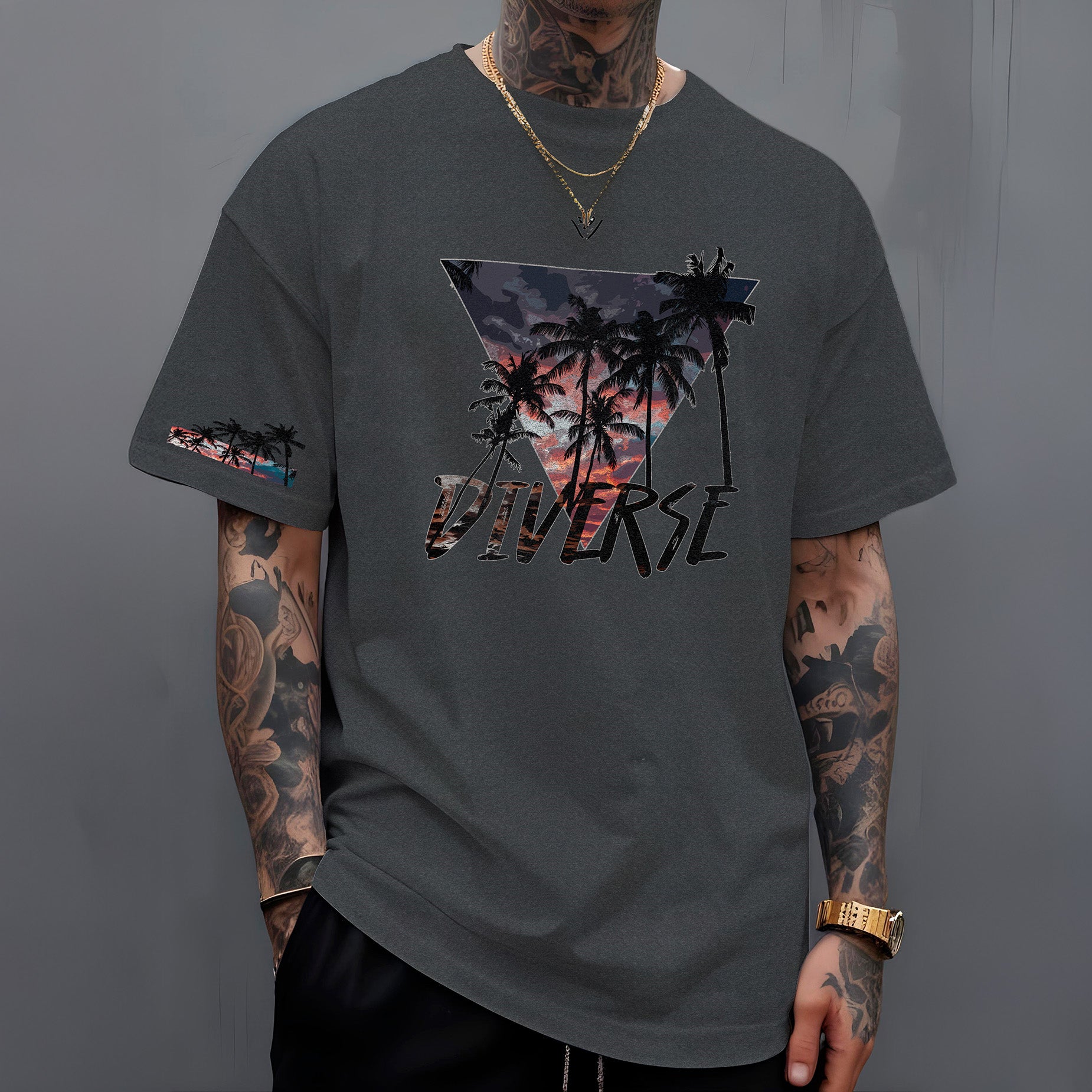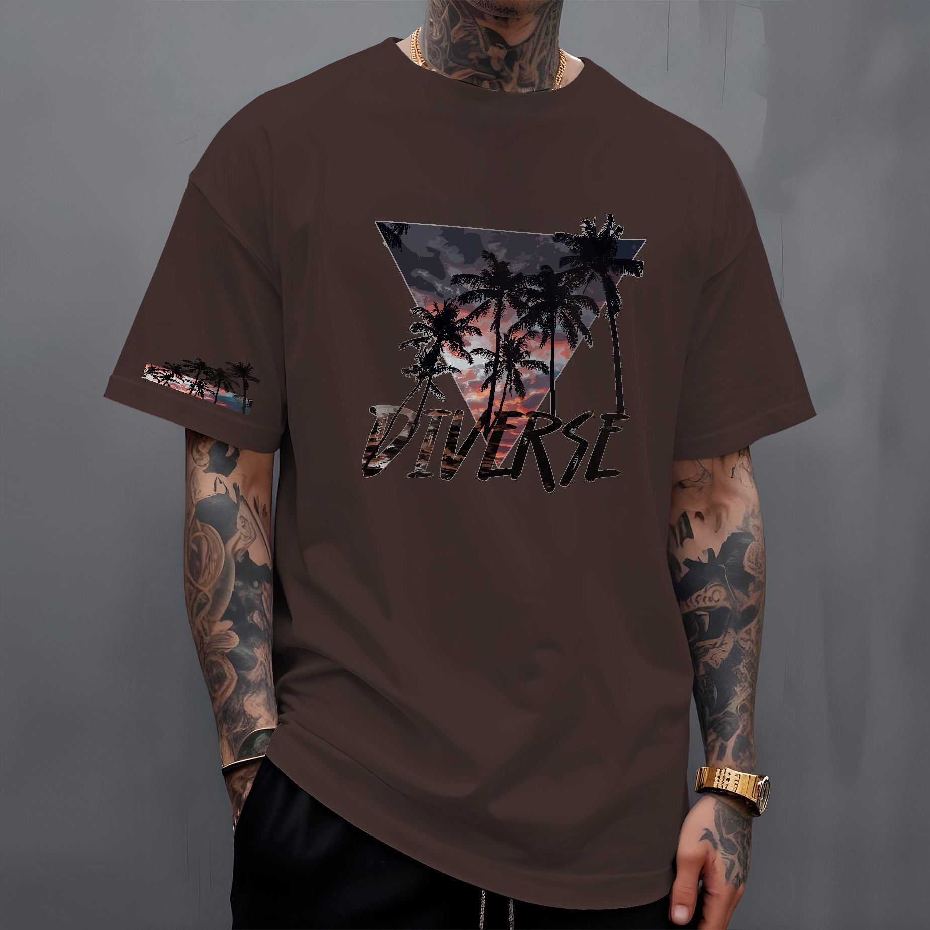 Leve o calor e a beleza dos trópicos com você! A camiseta " Diverse Tropical " apresenta um design vibrante e cheio de estilo. Nas costas, um triângulo preenchido com uma paisagem tropical deslumbrante, com um céu em tons de laranja e roxo, evoca o charme das cores do pôr do sol compondo a paisagem dos coqueiros. Abaixo, o nome DIVERSE em destaque reforça a identidade da marca.